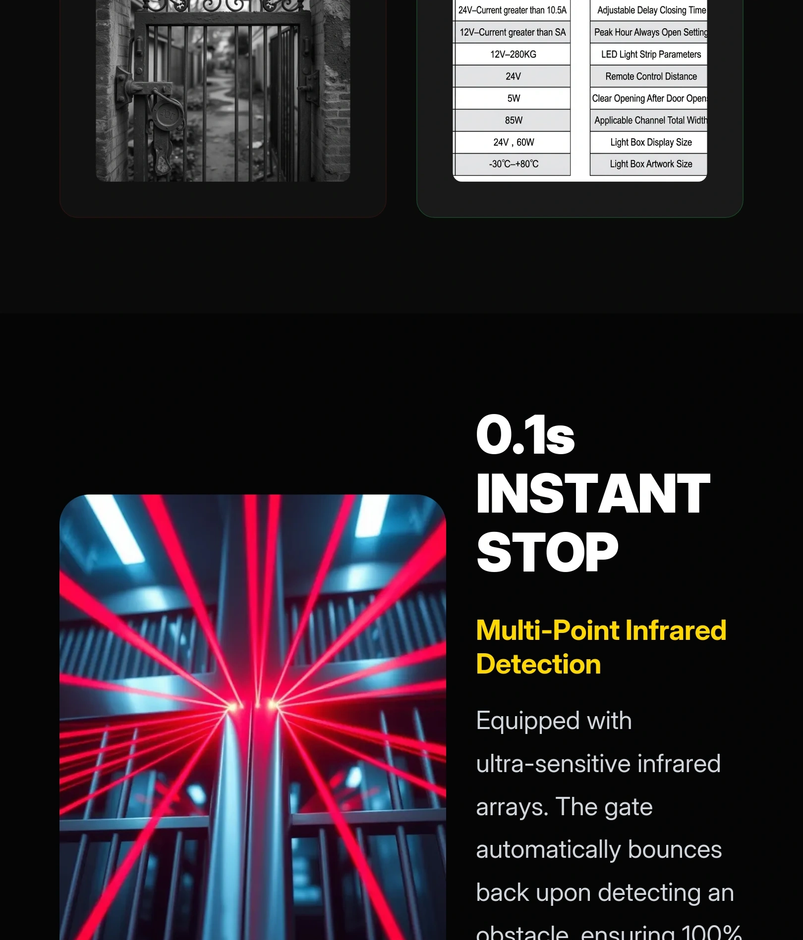 Built-in infrared obstacle detection, anti-pinch sensor, and emergency stop function—prevents accidents. Overload, overvoltage, and overheating protection ensure safe operation 24/7.